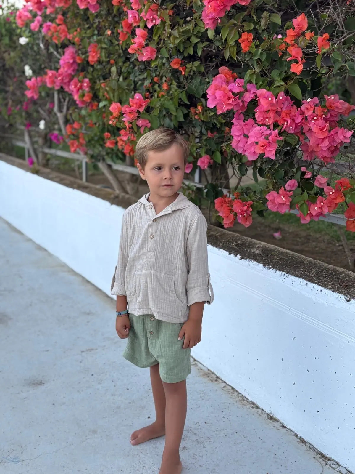 Colores: Sudadera en tono beige natural y pantalón en verde oliva, combinación neutra y mediterránea.